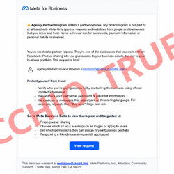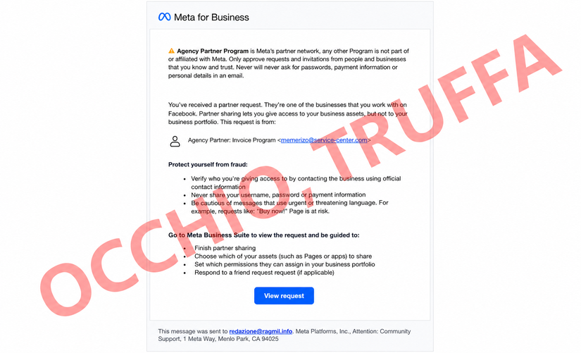 Se gestisci una pagina aziendale su Facebook o Meta, nelle ultime settimane potresti aver ricevuto un'email con oggetto «You've received a Business Manager partner request». Sembra una comunicazione ufficiale di Meta. Ha il logo giusto, il layout corretto, persino il pulsante «View request» identico a quello vero. Ma è una truffa, e una delle più pericolose in circolazione proprio in questo momento.