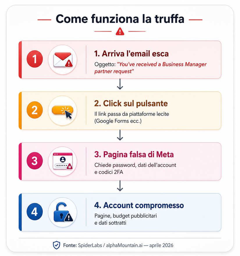 Il meccanismo è sottile. Gli attaccanti non inventano email false partendo da zero: creano o compromettono account Facebook Business reali, poi inviano richieste di partnership genuine attraverso il sistema Meta Business Manager. Il risultato è che il messaggio arriva da infrastruttura autentica, passa i filtri antispam e non lascia tracce sospette nell'intestazione tecnica.